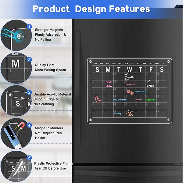 śledź ważne daty i umówione spotkania dzięki naszemu kalendarzowi magnetycznemu, zaprojektowanemu do łatwego przyklejenia na lodówce lub dowolnej innej powierzchni magnetycznej.