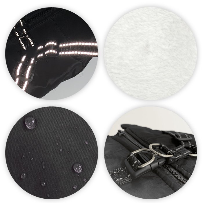 Kurteczka z tyłu jest odblaskowa i regulowana, można ją połączyć z różnymi smyczami dla psów. Nie musisz osobno kupować płaszcza i śliniaka, ponieważ nasz płaszcz dla psa zapewnia jedno i drugie. Pomimo dobrze pokrytej sierści, psom nie będzie przeszkadzać, gdy będą chciały się załatwić i załatwić jakąś potrzebę.