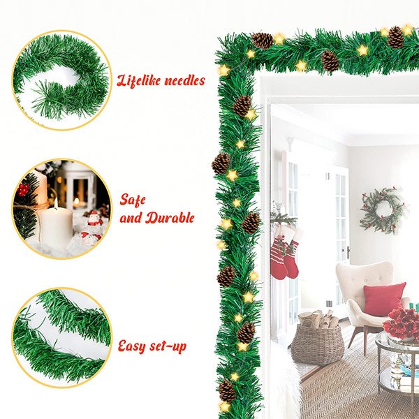 Każdy łańcuch jest starannie wykonany z gałązek sosnowych, zapewniając oszałamiający i autentyczny dekor świąteczny, który zaimponuje Twoim gościom.
