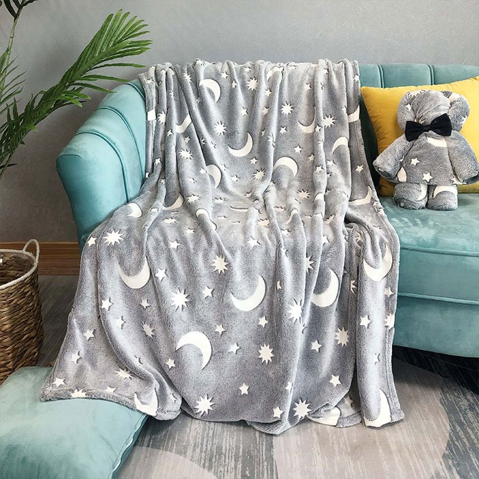 Zadbaj o spokojny i przyjemny sen swoich dzieci. Kocyk wykonany jest z miękkich i wytrzymałych materiałów, zadrukowanych gwiazdkami i księżycami, które świecą w ciemności i eliminują lęk dziecka przed ciemnością w nocy.