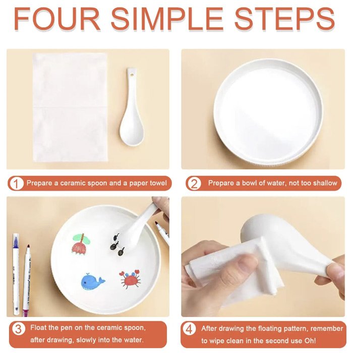 Kiedy otworzysz magiczny pisak akwarelowy i pomalujesz coś na gładkiej powierzchni, konieczne jest równomierne wypełnienie rysunku, musi odpoczywać przez 5-10 sekund, aby wyschło. Następnie powoli umieść powierzchnię, na której malowałeś, w wodzie i powoli, delikatnie potrząśnij, aby farba spłynęła. Pióro nadaje się do wszystkich gładkich powierzchni, takich jak szkło, ceramika, wyroby z tworzyw sztucznych, drewno, biała tablica, papier itp.
