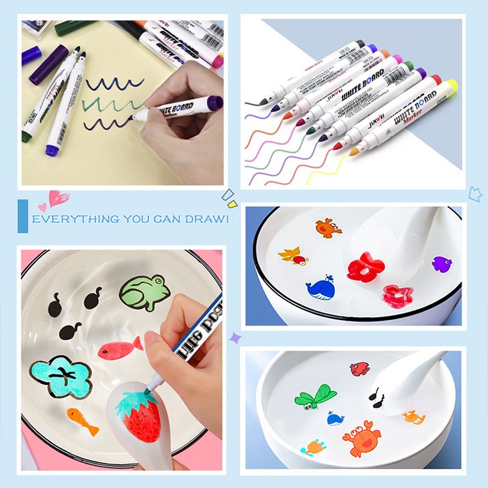 Kolorowe pisaki magiczne przeznaczone są do malowania na tablicy, malowania wodą oraz na dowolnych powierzchniach. Nadają się do malowania graffiti dla dzieci na papierze, do pisania, a także przydają się podczas spotkań biurowych. Dzięki tym długopisom stwarzysz nieograniczone możliwości kreatywności, ponieważ mogą rysować wszelkiego rodzaju małe rybki, żółwie, delfiny, kwiaty, motyle i inne, które w końcu wypuszczają, by unosiły się na wodzie.