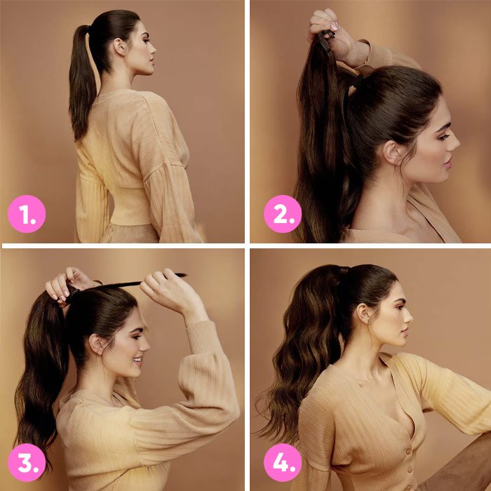 Uczesz swoje naturalne włosy i zepnij gumką w kucyk. Następne przyłóż pasek do gumki i owiń dokoła sztuczne włosy przylegające do gumki. Dla większej stabilności zabezpiecz kucyk przy pomocy spinki do włosów.