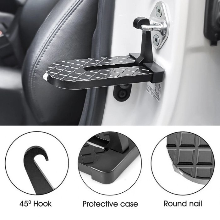 Przenośny stopień wykonany jest z trwałych materiałów, które mają być antypoślizgowe, co zapewnia bezpieczeństwo. Jest również lekki i kompaktowy, dzięki czemu można go łatwo przechowywać w bagażniku lub dowolnej szufladzie, gdy nie jest używany.