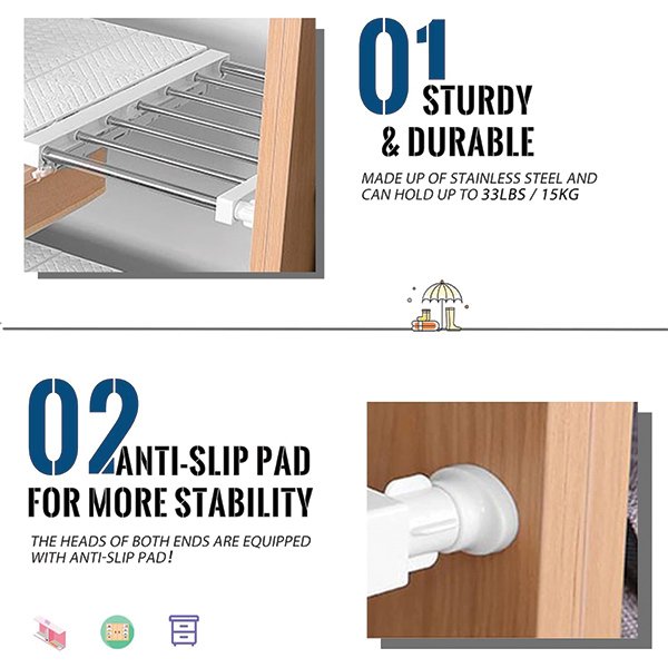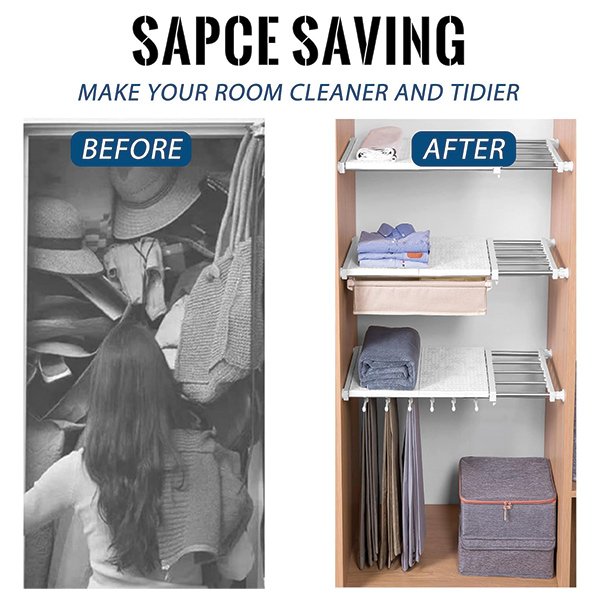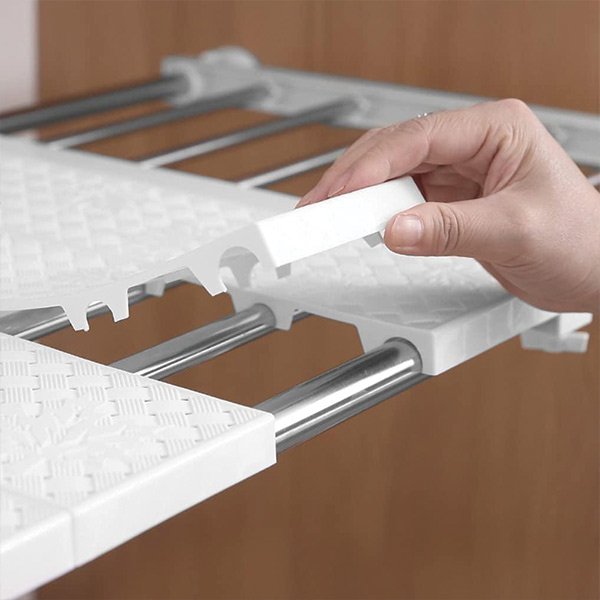 Zdobądź porządek dzięki Shelfy – rozsuwalnej półce, która dodaje dodatkowe miejsce do przechowywania w Twojej szafie bez konieczności użycia narzędzi ani montażu.