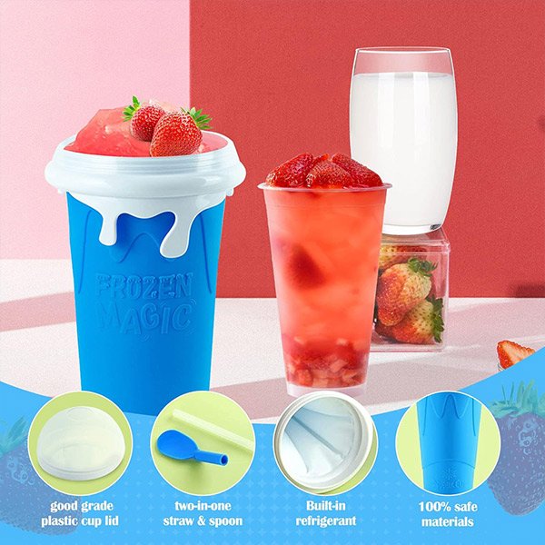Kubek Slushy do robienia napojów lodowych jest na tyle kompaktowy, że mieści się na każdym blacie lub stole, co czyni go idealnym na pikniki, imprezy grillowe i inne wydarzenia na świeżym powietrzu. Ciesz się orzeźwiającym napojem lodowym, gdziekolwiek jesteś!