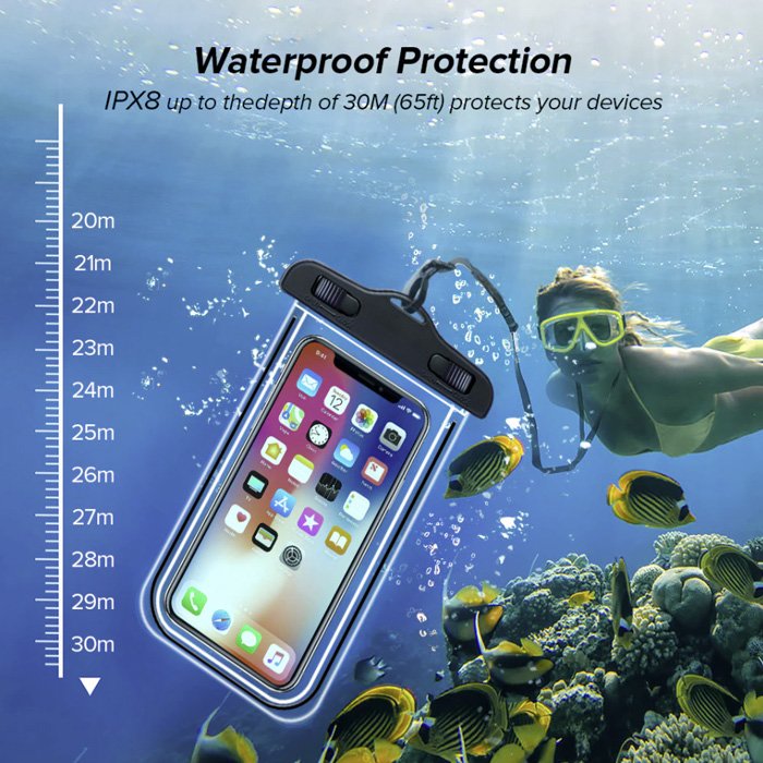 Etui nadaje się do użytku na głębokości do 30 metrów. Dlatego też świetnie nadaje się również dla każdego, kto lubi nurkować na wdechu lub ze sprzętem do nurkowania.